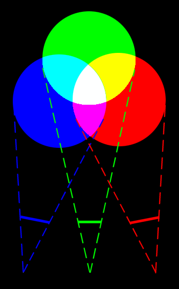 Tre fasci di luce nei colori primari (blu, verde, rosso), sovrapponendosi due a due formano i colori complementari (giallo, magenta, ciano); dove si sovrappongono tutti e tre, danno origine al bianco.